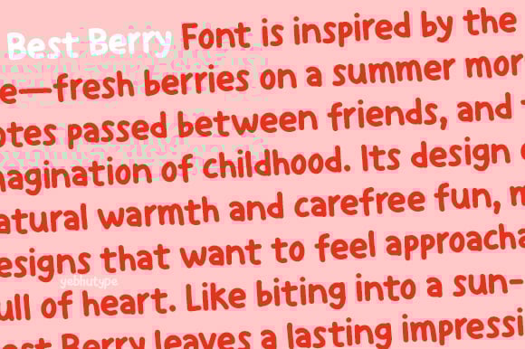 Best Berry Font is inspired by the simple pleasures in life—fresh berries on a summer morning, handwritten notes passed between friends, and the boundless imagination of childhood. Its design embodies a sense of natural warmth and carefree fun, making it perfect for designs that want to feel approachable, friendly, and full of heart. Like biting into a sun-ripened strawberry, Best Berry leaves a lasting impression of sweetness and delight.